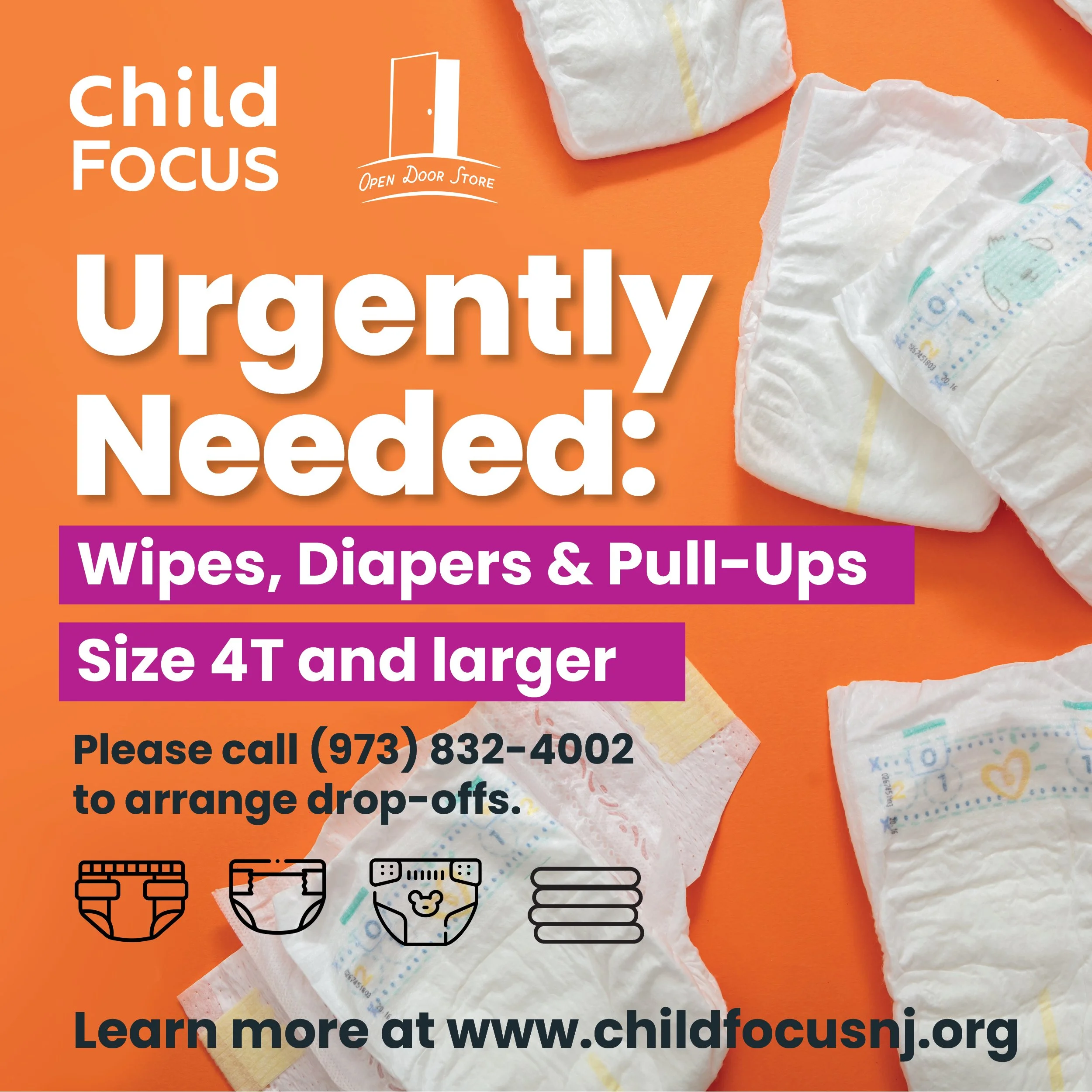We urgently need more baby wipes, and diapers/pull-ups size 4T and larger (for larger older babies). If you can donate diapers or wipes, we would greatly appreciate it! Drop-offs or deliveries can be made at Child Focus, 415 Hamburg Turnpike, Suite D2, Wayne, or call us on (973) 832-4002 for more information. Thank you!